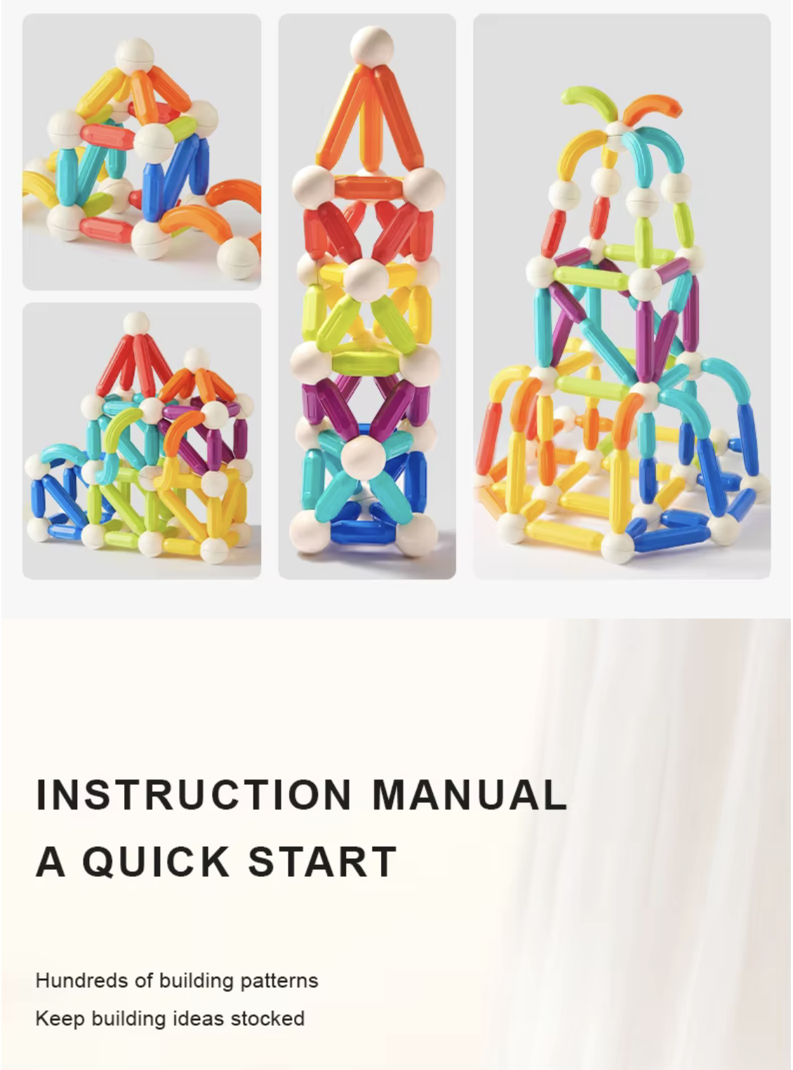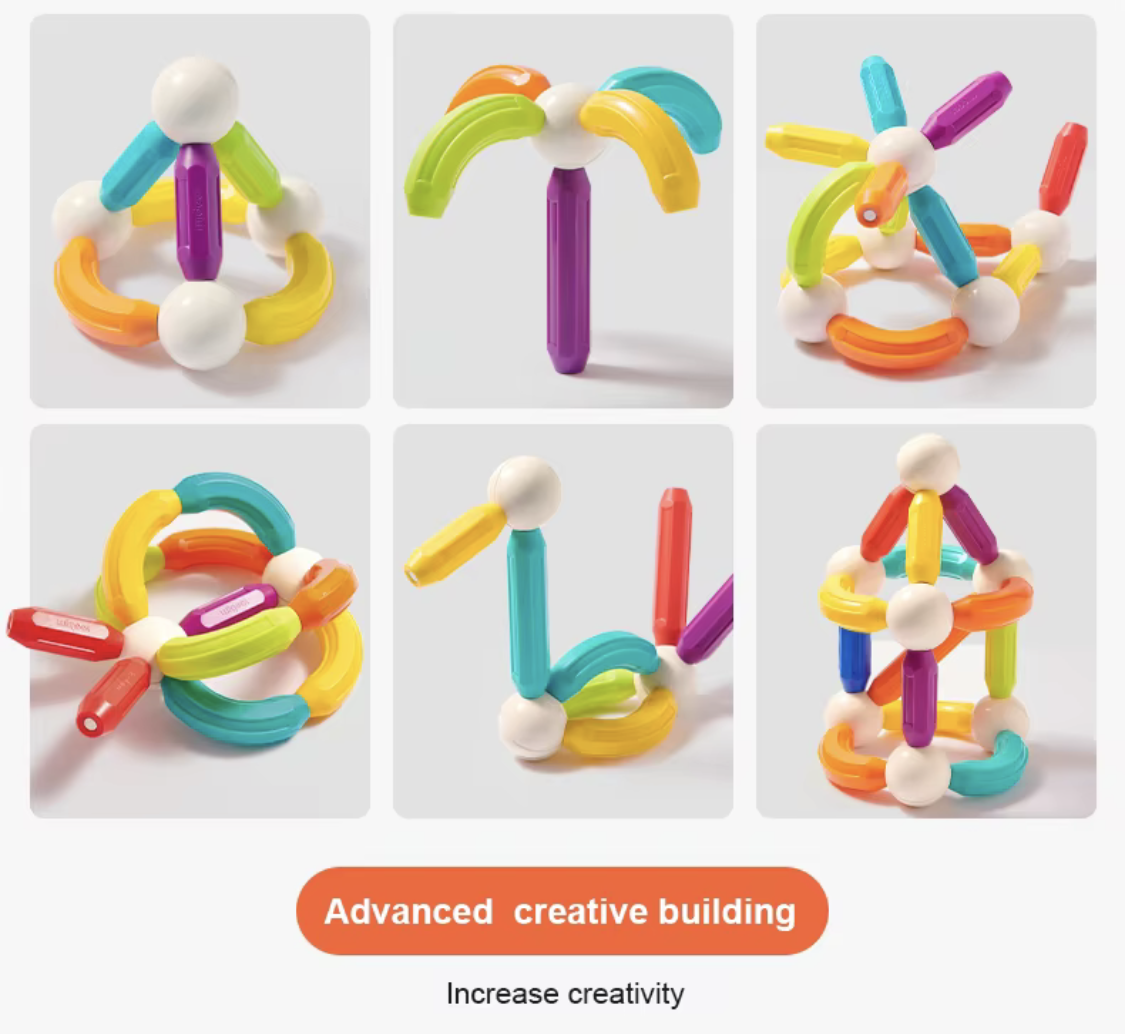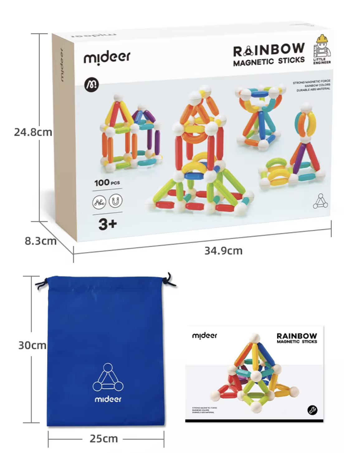 彩虹磁力棒(100PCS)。更安全的彩色磁力棒,磁力強勁,堅韌耐摔。專為孩子設計的大顆粒設計、好抓握,杜絕吞誤意外。明亮配色,滿足孩子好奇心、激發探索欲。360度圓潤光滑,無毛刺不扎手,附有收納袋,存放更省心,整潔不占空間。