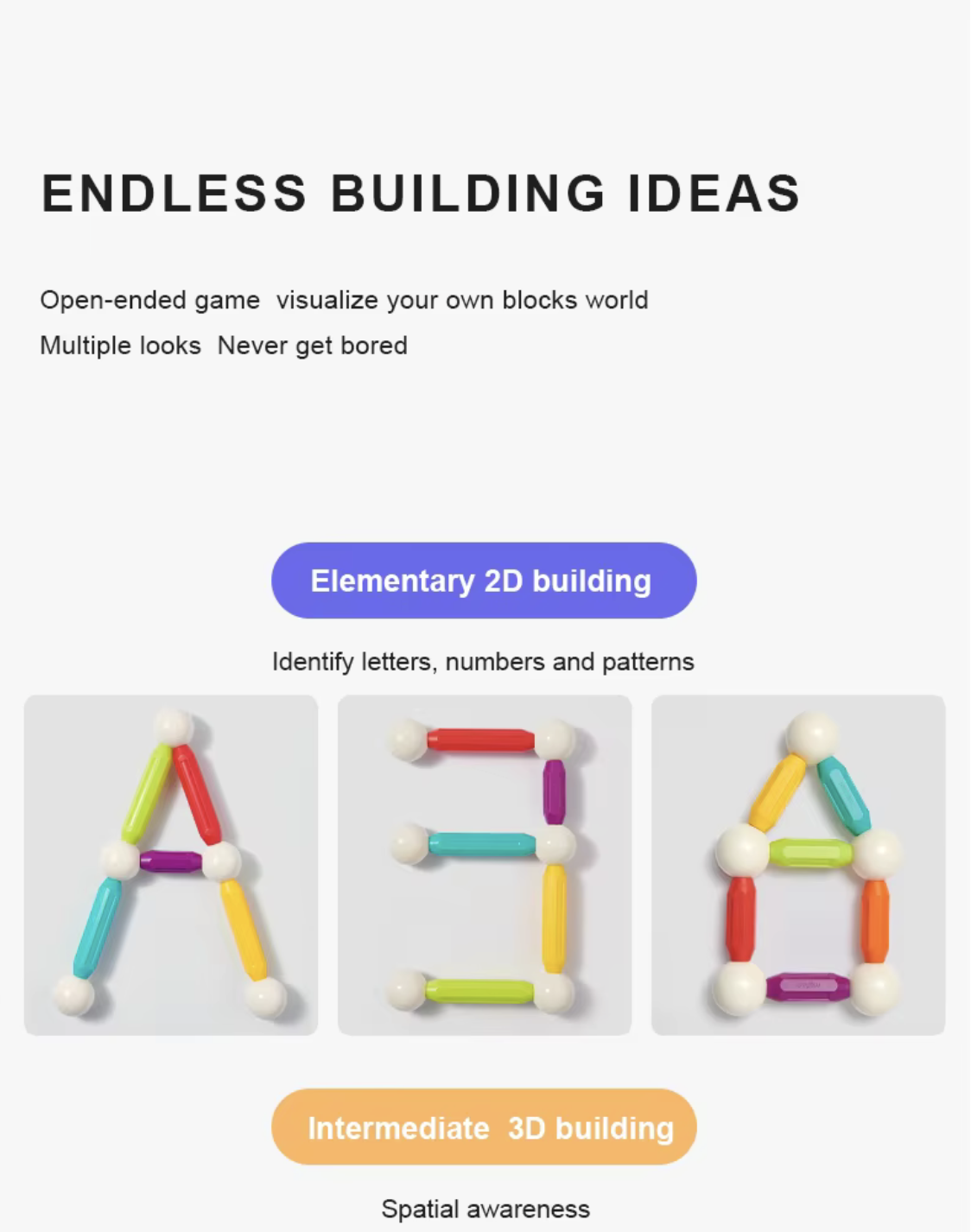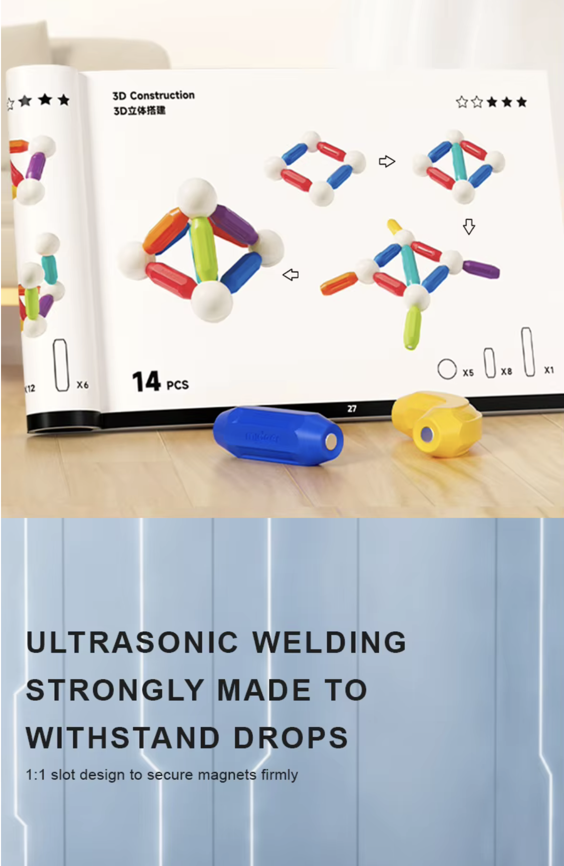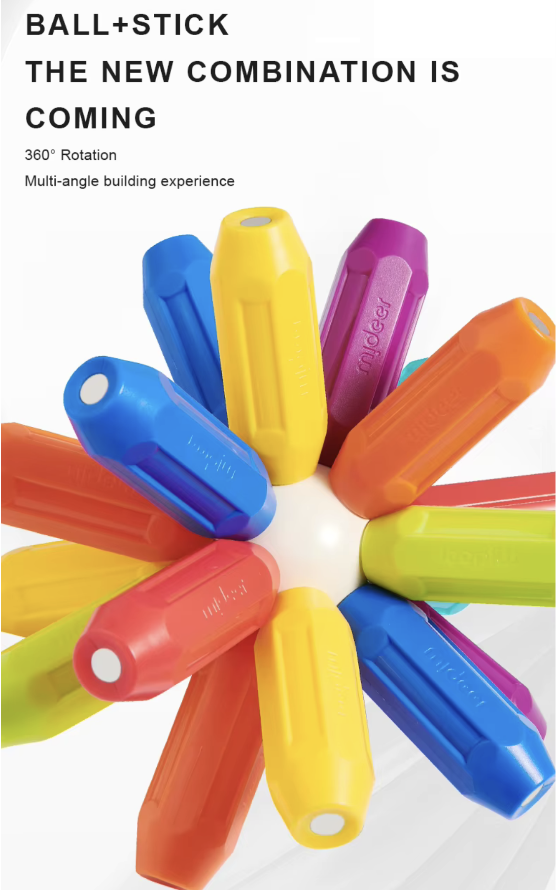 彩虹磁力棒(100PCS)。更安全的彩色磁力棒,磁力強勁,堅韌耐摔。專為孩子設計的大顆粒設計、好抓握,杜絕吞誤意外。明亮配色,滿足孩子好奇心、激發探索欲。360度圓潤光滑,無毛刺不扎手,附有收納袋,存放更省心,整潔不占空間。
