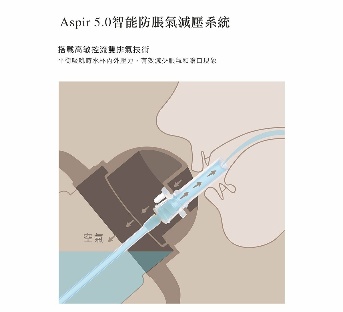 Aspir 5.0智能防脹氣減壓系統,平衡吸吮時水杯內外壓力,有效減少脹氣、嗆口現象。