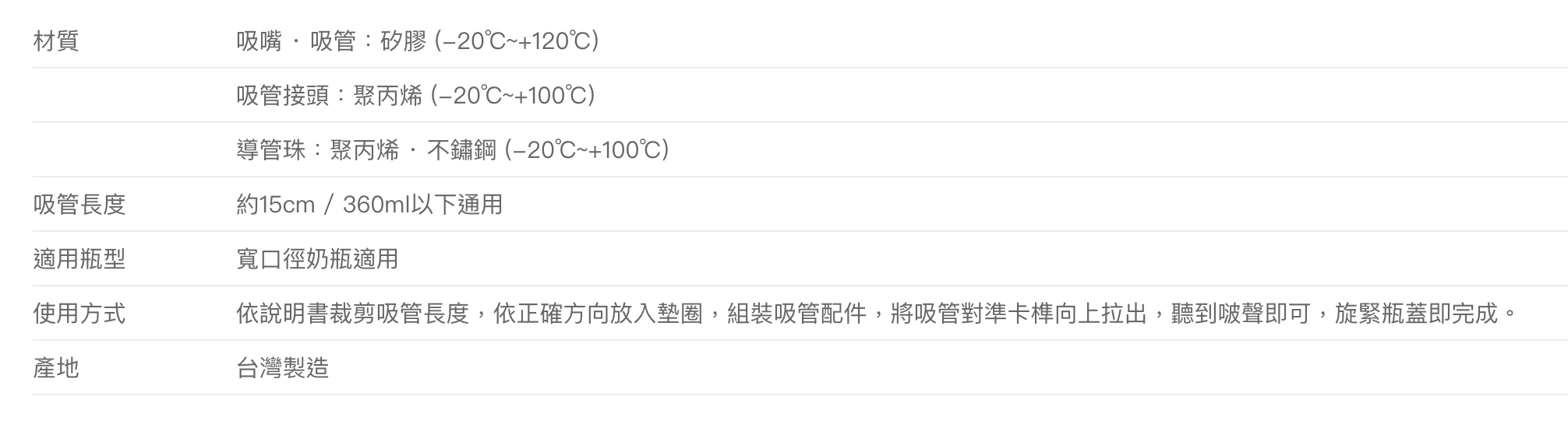 適用瓶型	寬口奶瓶 200ml / 270ml / 360ml
