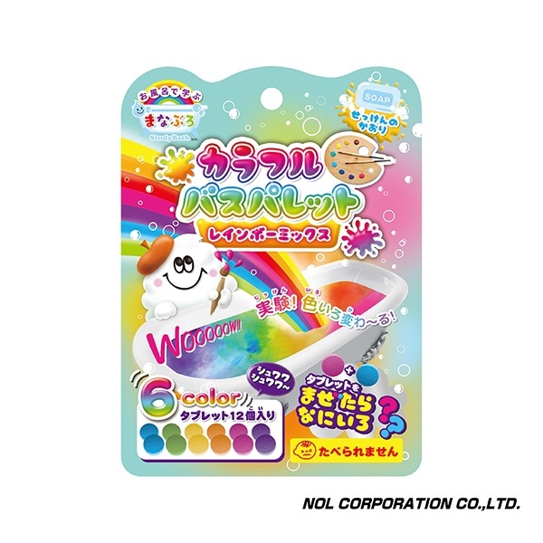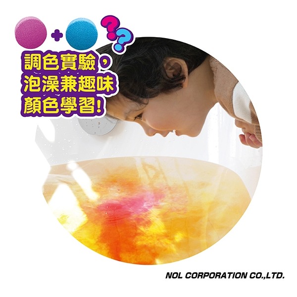 入浴錠設計,將不同顏色入浴錠投入水中,觀察色彩的變化,泡澡兼趣味顏色學習!