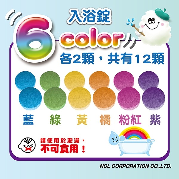 入浴錠有6種顏色(藍、綠、黃、橘、粉紅、紫),各2顆,共有12顆。(不可食用)