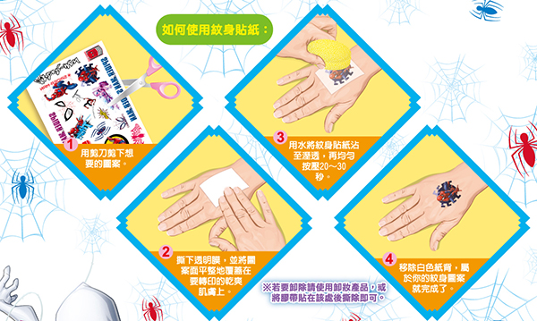 本書共32頁,其中有3種著色類型豐富塗畫樂趣;另附1張親膚無毒紋身貼紙+2頁多用途可愛角色貼紙。