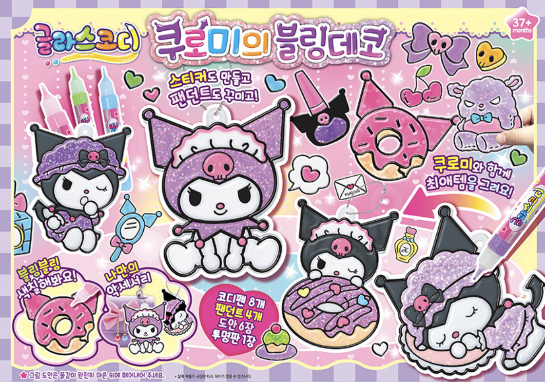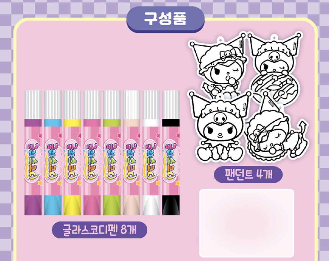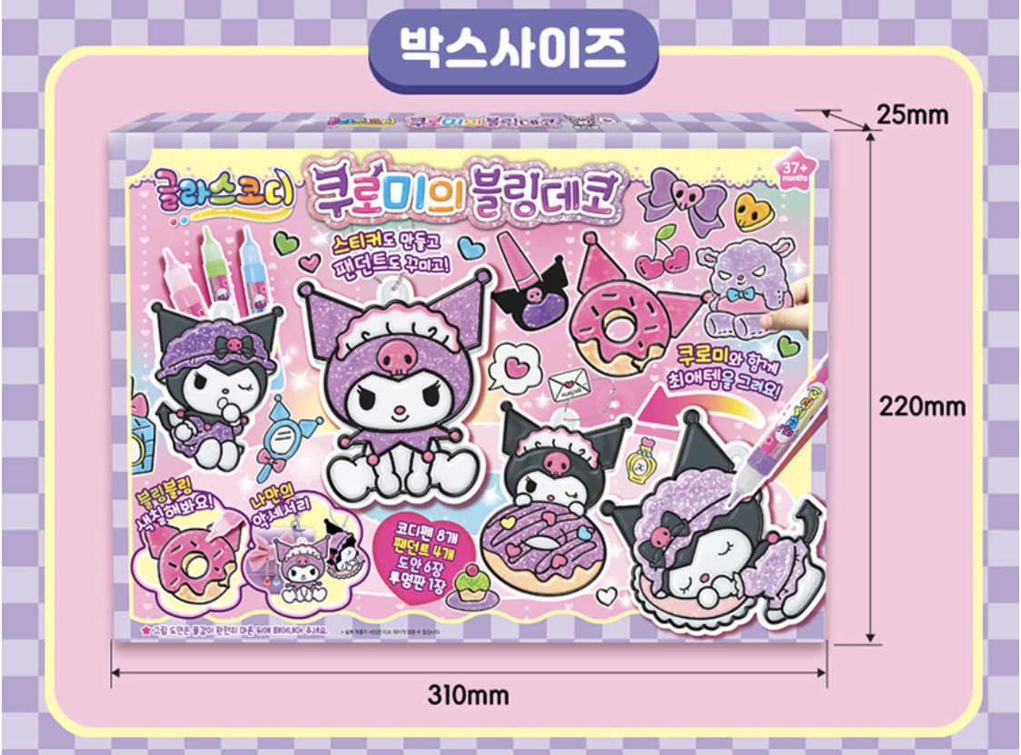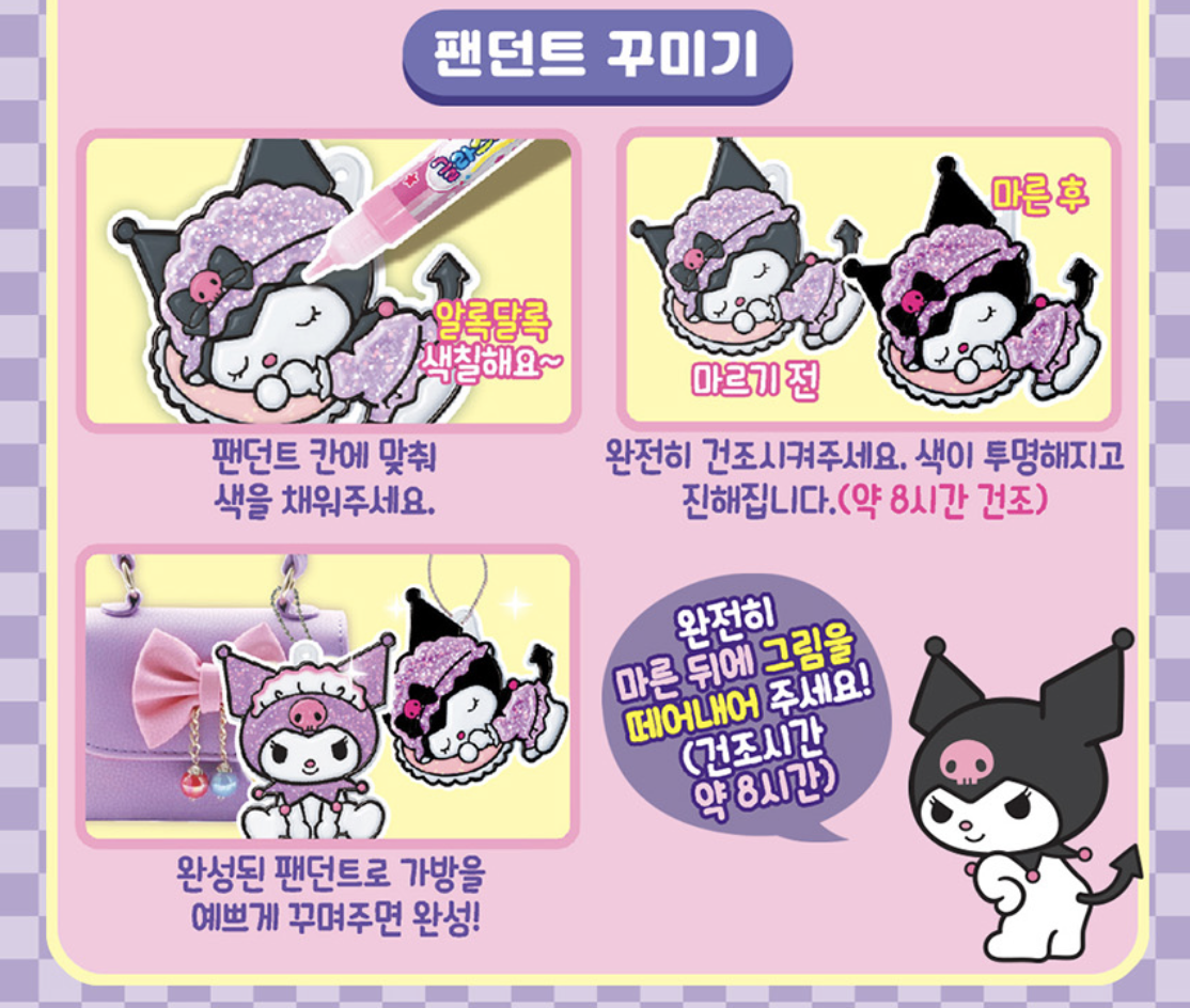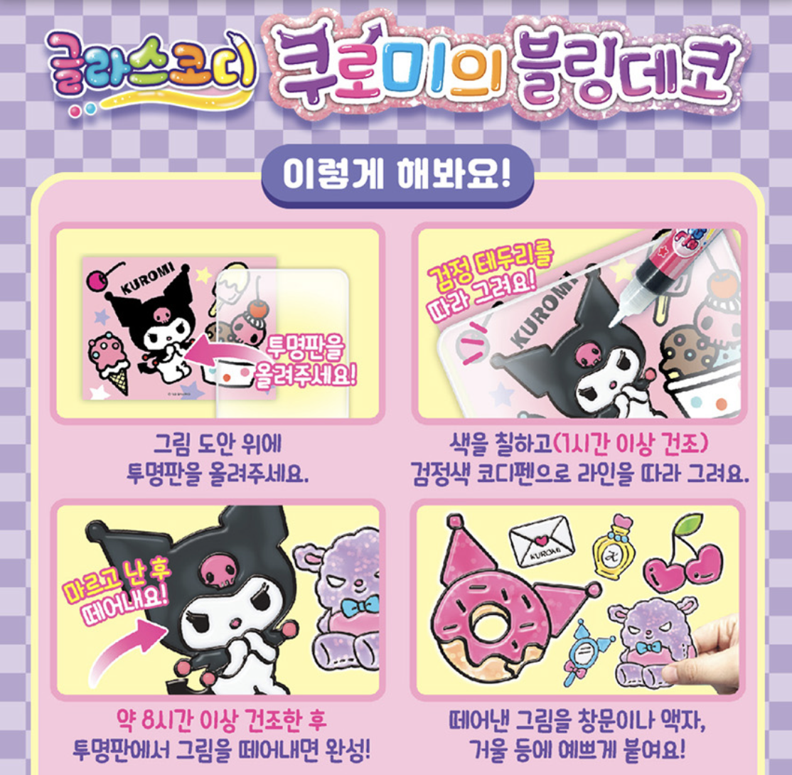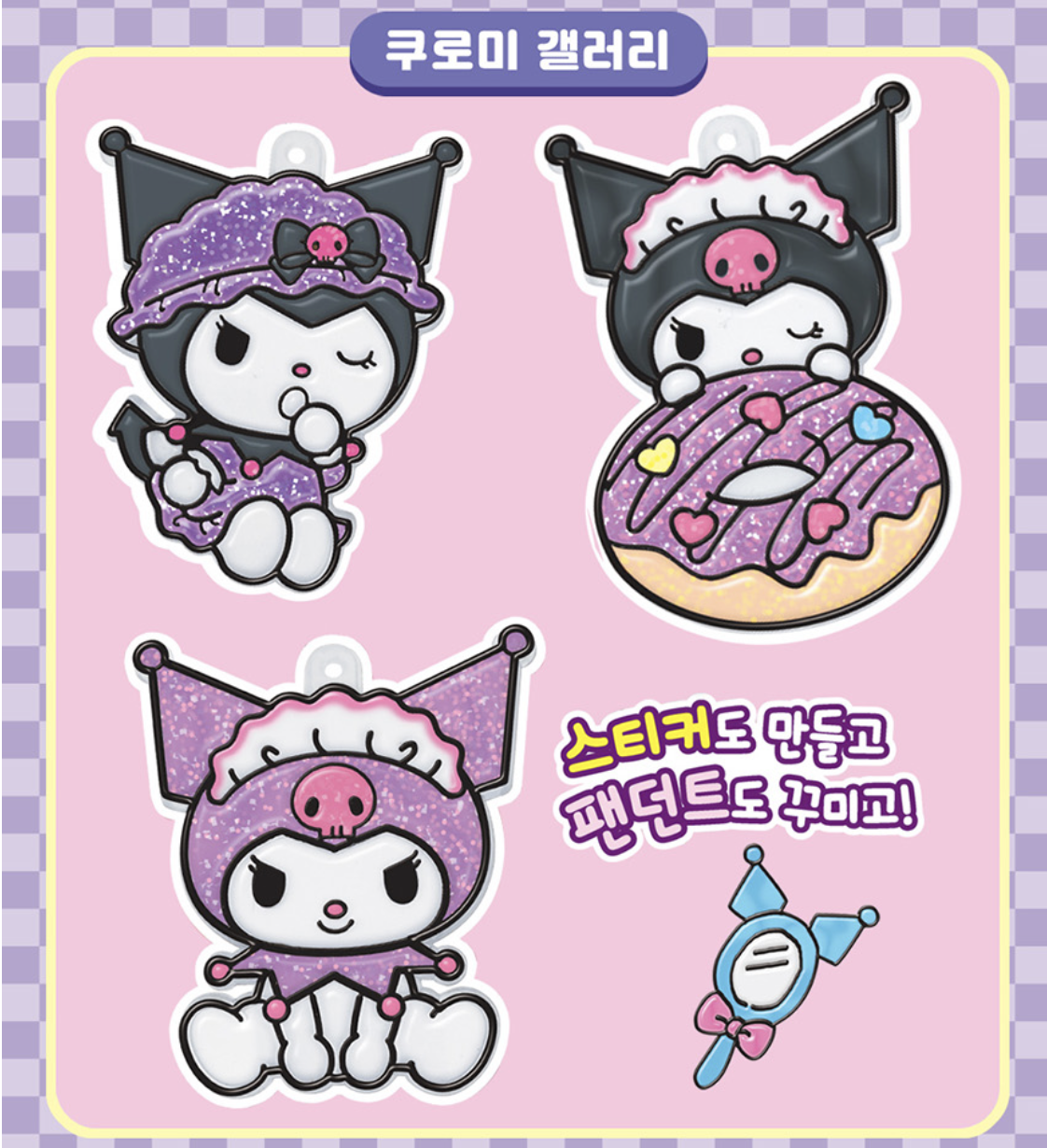 呢一個套裝可以俾小朋友自己整Kuromi匙扣或者自己畫Kuromi,匙扣可以掛書包(鏈扣須自備)玻璃畫整完可以貼喺玻璃、窗、鏡、瓷磚等套裝包括:玻璃畫顏料🎨8色、膠片、圖案底紙、吊飾底座4個