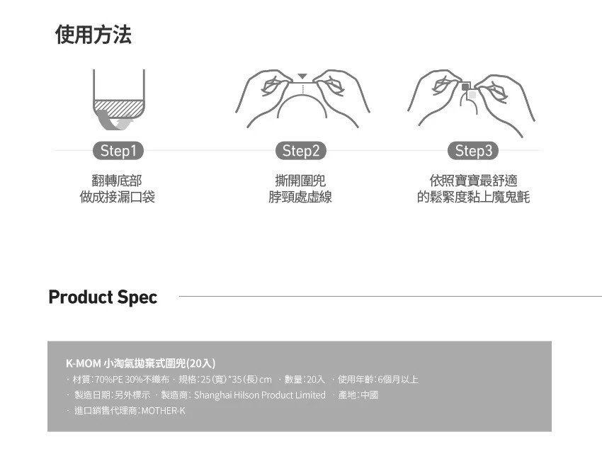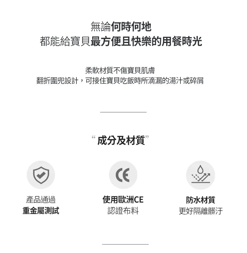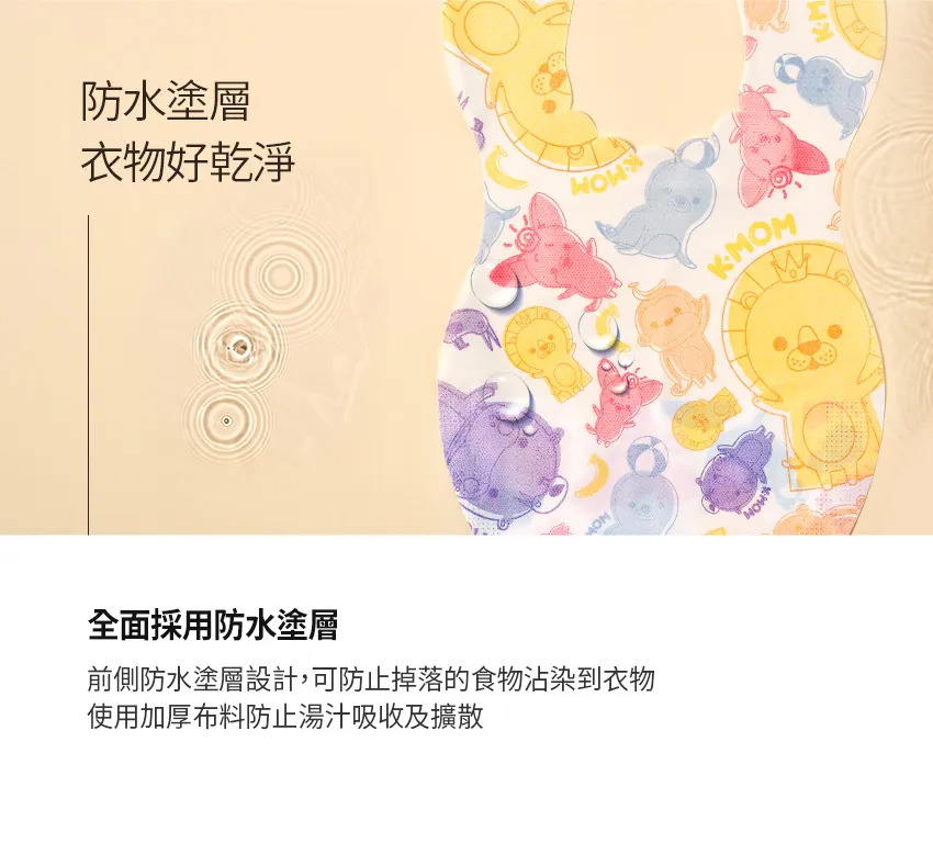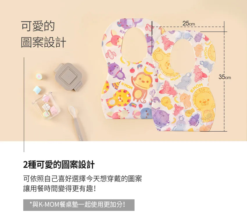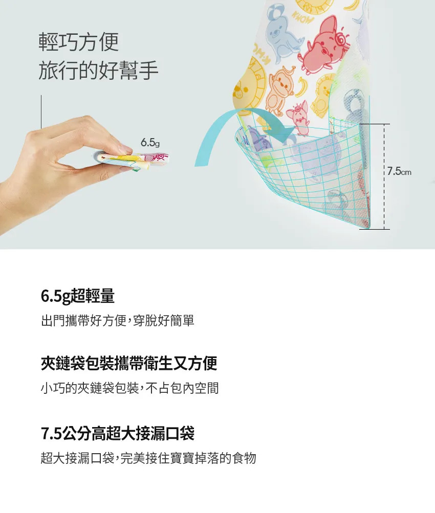 貼心的大口袋及防水設計,一包有2種花色搭配衣著,讓寳寳在外面用餐也可以乾爽很有型